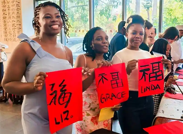 他们拿起毛笔尝试书写“福”字与自己的中文名字,体验传统绘画创作,即兴作品的集中展示让大家收获了满满的成就感。