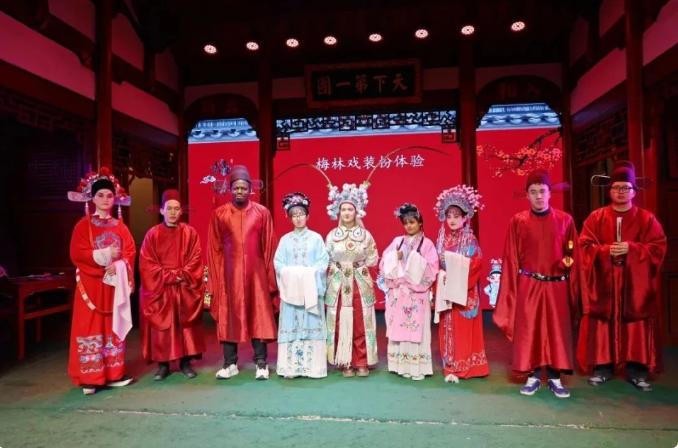 漫步全国重点文物保护单位尚书第,古老厅堂院落错落有致,师生们纷纷赞叹中国建筑的精巧与宏伟。随后,大家来到梅林戏展示中心,欣赏经典剧目《醉打金枝》。许多师生都是第一次观赏传统戏曲,看得格外入神。演出结束后,大家还换上戏服、亲身体验,着实过了一把戏瘾。